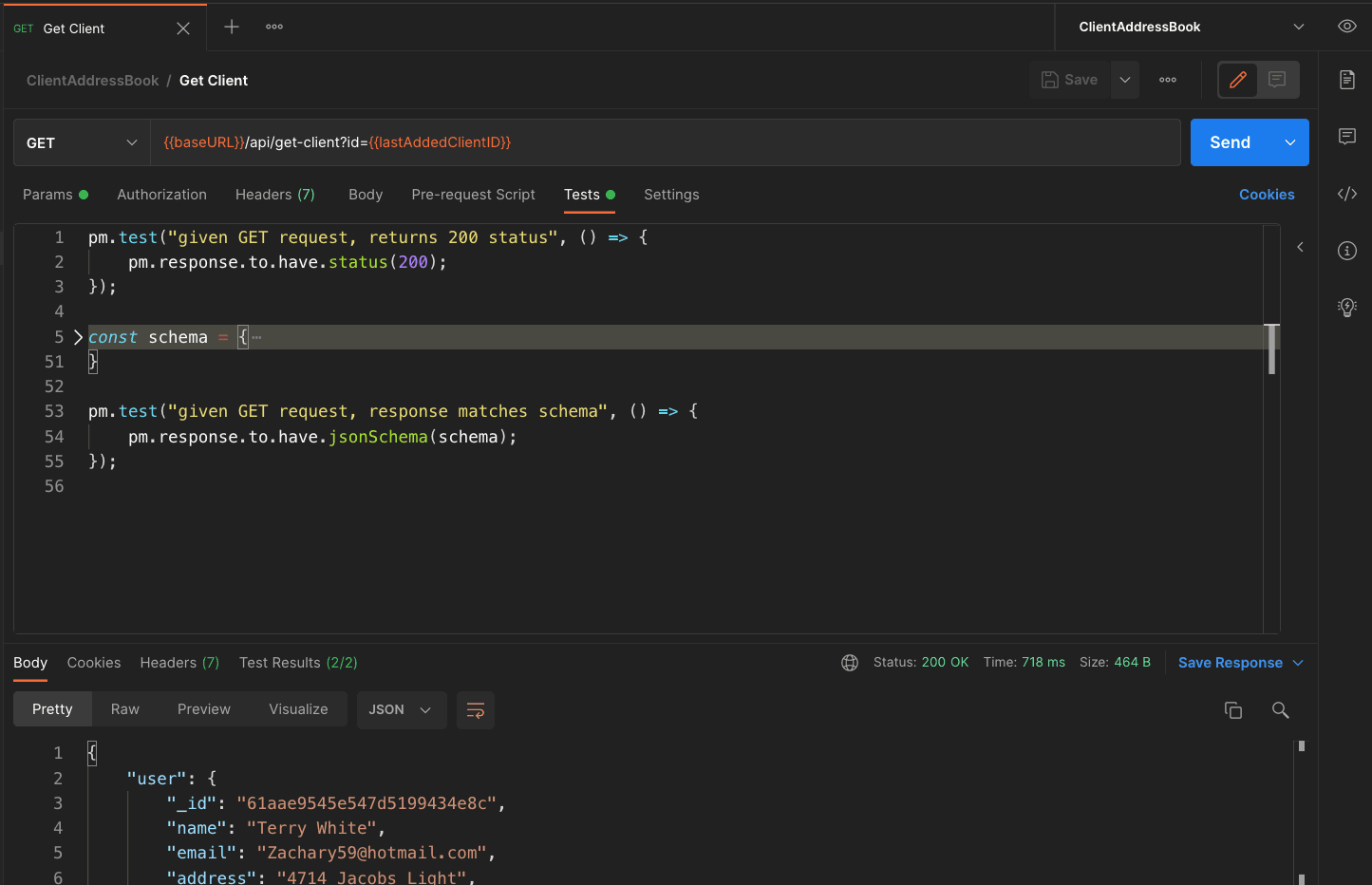 In the previous code, we grab the id of the last added client and store it in our collection variables. The test to verify the status code is identical to the /api/add-client test, so instead, we will focus on the schema validation: